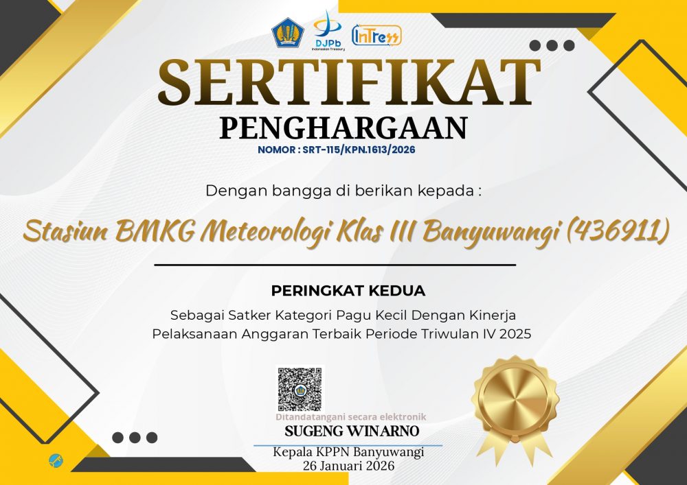 Banyuwangi, 2 Februari 2026 – Stasiun Meteorologi Banyuwangi berhasil meraih Peringkat Kedua Kategori Pagu Kecil dengan Kinerja Anggaran Terbaik Periode Triwulan IV Tahun 2025. Penghargaan ini diberikan oleh Kantor Pelayanan Perbendaharaan Negara (KPPN) Banyuwangi sebagaimana tertuang dalam Surat Kepala KPPN Banyuwangi Nomor S-68/KPN.1613/2026 tanggal 26 Januari 2026 serta Surat Keputusan Kepala KPPN Banyuwangi Nomor KEP-16/KPN.1613/2026 tanggal 26 Januari 2026.